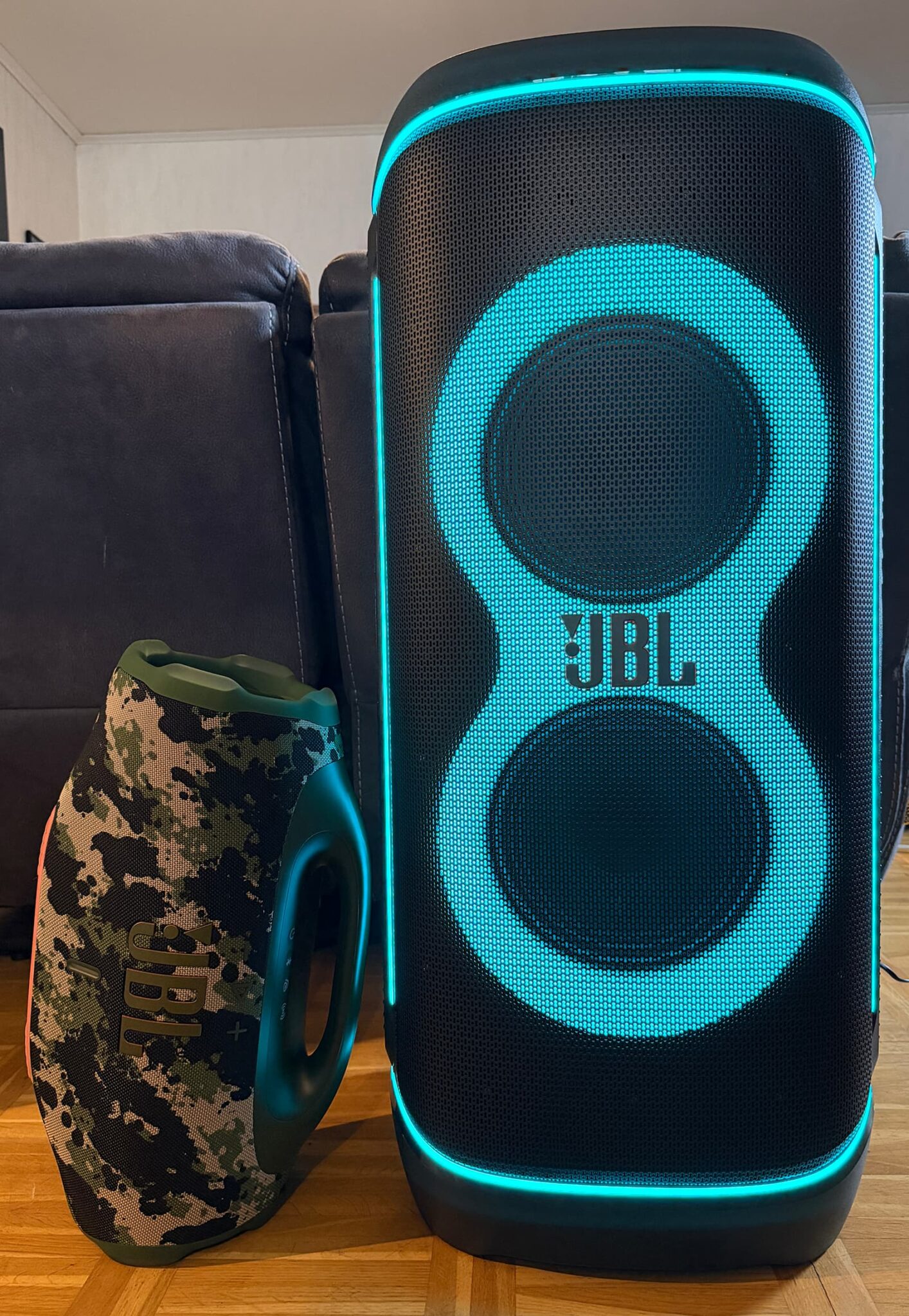 JBL PartyBox 720 kostade 10 000 kr när den släpptes i höstas, och redan då var den rimligt prissatt. Nu har JBL sänkt priset med 2 000 kr till 7 990 kr, vilket gör högtalaren löjligt prisvärd! Det ska sägas att även om PartyBox 720 går att spela trådlöst följer det inte med några batterier (de får man köpa separat), så det är sladd som gäller här. Här till höger ser ni hur mycket större PartyBox 720 är än Boombox 4.